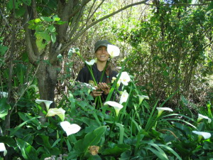 この近くに一面水芭蕉が咲いていて、採って部屋に飾った。この花は再生力が強くまたすぐ咲く んだ。 |