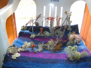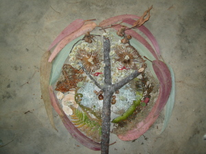 森に落ちてた葉、実、花、シダ、苔で作った ”symbol of peace” と ”It's a small world” |