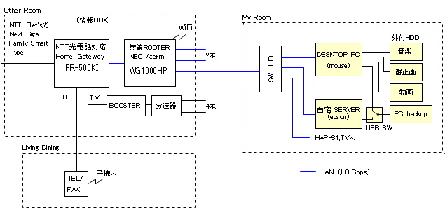 音楽、静止画、動画、その他データは外付けHDDに格納しています。 各HDDはRAID1の二重化としています。 現在、自宅SERVERとUSB SWは外しています。