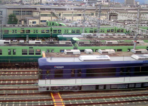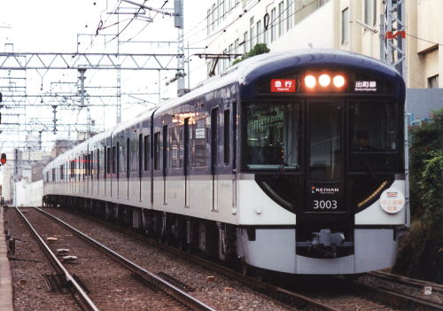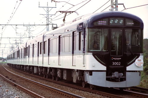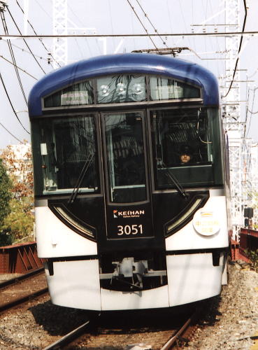 京阪新時代の旗手、新3000系。月欠く闇を切り裂くおでこの3連灯。