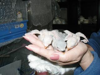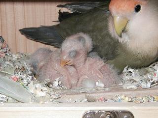 2度目の出産は毎日続けて産みました。(孵化が毎日でしたので・・) 21日間クロベー君といっしょにひたすら温めて3羽のベビーが誕生しました。 巣作りはマロンの仕事でクロベー君はせっせと食事の係りでした。 夜もママとパパは仲良く巣箱に入っていました。 |