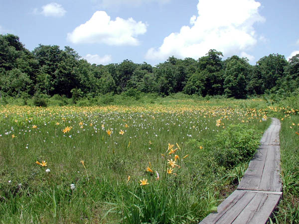 | 当時は真夏のような暑さでした。 湿原では遮るものが何もなくて、 半分熱射病になりそうだった記憶があります。 奥の黄色い帯がニッコウキスゲ。 |