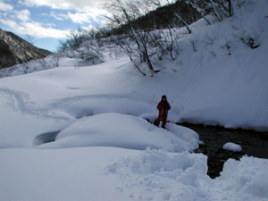 湯檜曽川の河原が 雪原となって 私たちを迎える。 膝までの新雪を かき分け 道を作っていく。 |