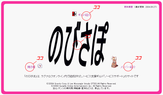 このサイトについてのご案内 リンクフリーです。リンクは【http://www7a.biglobe.ne.jp/~second/luna.htm】にすると便利です。 バナーは、コチラ。ひらがなで「のびさぽ」と書いて下さってもOKです。 動作確認は、IE(6.0?)のみの確認となっております。 JavaScriptが使用できないと、正常に動作しない部分があります。 間違い等のご指摘は、掲示板へお願いします。 コンテンツは、おおまかに分けて4つ。 ギルド紹介、メンバー紹介、掲示板、案内(現在のこのページ)です。 ![]() あと、オマケ的な部分が お世話になっているサイト ! RO JUNKY !(フェンリル版ノービス名鑑) 私も、登録しております。「NOVICE in Fenrir」をクリックすれば、そこにはステキなノビ達がいっぱい。 リボン村 リボン好きは、ここに集まる。のびさぽの「.凛..」さんは、ここの村長さんなのです。(今はGarmで活躍中) DEIYU-STUDIO(でいゆ工房) メンバー紹介のスキンは、こちらで作成されたものを使用しております。便利。 爆裂健ホームページII Javaアプレット「ノービス大脱出」は、こちらで作成されたものを使用しております。便利。 ![]() |