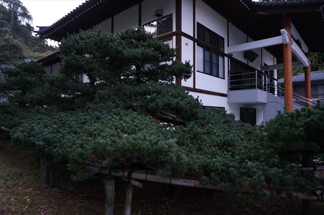 | 西念寺の臥龍のマツ 境内にある庭園の南端に植栽されたヒメコマツである。根元周囲1.6m、目通り樹囲1.2m、地上1mほどで、主幹は横にねじれ太い枝を四方に出して地を這う様は見事である。 本樹はもともと側枝の挿し木に由来するに違いなく、ヒメコマツの本来の直立性はなく、人為的に支えられて、数本の枝先が天空を指す。株元から続く主軸の高さは、約3.7mに及ぶ。 その様は臥龍の頭尾を立てる姿に似ている。 寺伝によれば、本樹は伊達輝宗密葬の際に本寺に寄進されたという。従って、その樹齢は約四〇〇年とみられる。 二本松市教育委員会 |