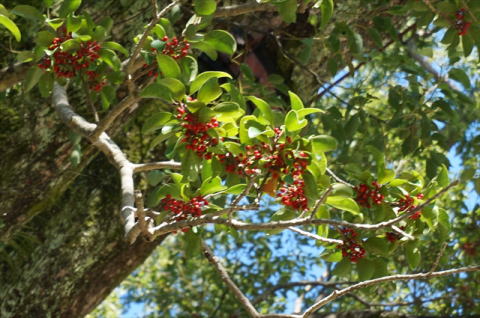 たしかに主幹の下部は凹凸激しくゆがんでいる。樹齢二千年の姿と思う。 赤い実生をつけ、樹勢は旺盛。御神木の注連縄に鈴がついていた。 |