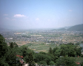 善光寺平が一望です。松本からの下り列車が入線してきました。 ホームには上下線両方の115系が並び、
