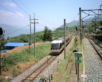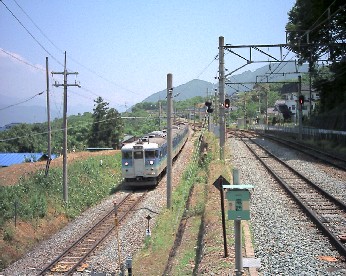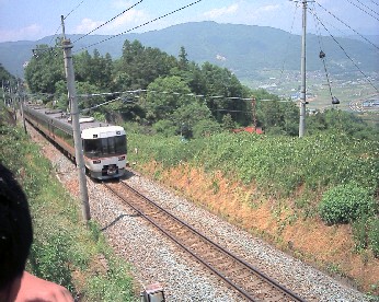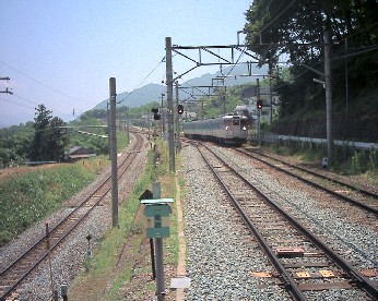 「L特急ワイドビューしなの」の通過を待ちます。松本方からのワイドビューしなのが通過です。 通過特急の後方 長野方への下り列車が一旦松本方へバックします。 折り返して長野へ向かいました。 珍しいスイッチバックを見学した上に、