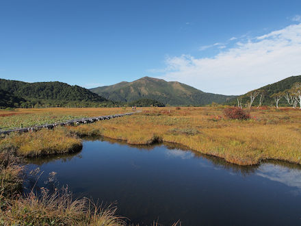 | 池塘も秋色に | 池塘と至仏山 | ||||