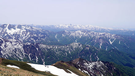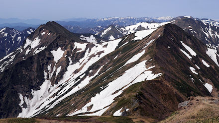 | 歩いてきた谷川岳の尾根 | 苗場方面の山々を望む | ||||