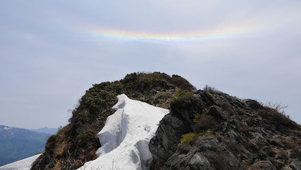 今回は残雪の谷川連峰を歩いてきました。 7時前に谷川岳ロープウェイに到着し、始発便で『天神峠』へ。 さらにここからリフトで『天神山』へ。 リフトから降りてすぐ左の池では、ミスバショウが満開。 ここは標高1500mぐらいなので、来週の尾瀬散策に期待が膨らみます。 ここから少し登ったところが山頂で、周りの景色が望めました。 準備を整えたら、いよいよ谷川岳に向け出発です。 この尾根道は、正面は谷川連峰、右手には朝日岳、足元はショウジョウバカマやイワウチワやカタクリなどの可愛い花々が咲いているので、のんびり歩いていきます。 時折残雪があるものの、アイゼンを使うまでもないくらい。 ただし避難小屋までの間に2か所ほどアイゼンがあったら安心の斜面があったので慎重に突破しました。 避難小屋から少し行った先に雪の登り斜面がありましたが、続かないと判断しストックを使いながら登りました。 読みは正解で斜面を突破するとすぐに雪が無くなりました。 ここから傾斜がきつくなってくるので、咲き始めたシャクナゲや周りの景色を見ながらゆっくり登っていきます。 肩の小屋手前の斜面は、長い雪の斜面。 ロープが張られているので蹴りこみながら登れば、アイゼンなしでも可能ですが、念のためアイゼンを装着し登りました。 この雪も不思議なもので、肩の小屋まで登ると消えました。 『肩の小屋』のベンチで万太郎山に続く稜線を眺めながら休憩です。 小屋から一登りすれば、『トマノ耳』。 さらにここから少し歩けば『オキノ耳(谷川岳山頂)』です。 展望は360°と素晴らしく、しかも誰もいないのでのんびりくつろぎました。 しかも上空には彩雲が出現してラッキー♪。 |