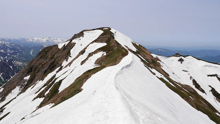 オキノ耳で下山をする人が多いそうですが、今回は茂倉岳まで行きます。 まずは一ノ倉岳を目指しますが、その途中にある一ノ倉沢は見たかった場所。 見下ろすその光景は迫力があり、吸い込まれそうな感じがするほど。 ここをロッククライミングする人がいて、死者も多く出ているそうですが、自分はそもそもこれを登ろうとは思えません… 一ノ倉岳の最後の登りは疲れましたが、一歩一歩登っていけば山頂に到着。 ここから茂倉岳に続く尾根道の半分は雪の上。 しかも右も左も斜面なので、滑落しないように足元を確認しながら歩んでいきます。 辿り着いた『茂倉岳』も誰もいない静かな山頂だったので、360°の景色を楽しみながらお昼休憩です。 |