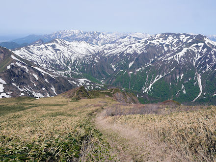 | 万太郎山方面に続く尾根道 | オキノ耳より白毛門、旭岳を望む | ||||