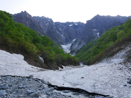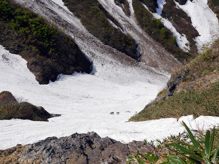 さて下山ルートですが、一ノ倉沢を下から見たかったので『中芝新道』を選びました。(旧道は現在工事中で、車で行けない為) 登山地図は破線、現地の標識も「難路・熟達者」と書いてありましたが、登山道の岩場道なら経験しているし問題ないと判断しました。 ただこれは正直失敗だったと後悔することに(-.-) 正面の朝日岳や大源太山などの周りの景色もそうですが、ハクサンコザクラやヤマザクラなどの花々や幽ノ沢などの岩壁を見ながら楽しく下っていく。 想定通り岩場も多いが、難無く突破していきます。 しかし下っていくと予想に反し雪の量が増えていく。 安全のためアイゼンを装着したが、軽アイゼンだったのもあり少し滑落… 滑落先の笹に突っ込んだ瞬間に全力で掴んだので、手の平以外怪我はない。 安心したのもつかの間で、目の前に急斜面の雪渓が立ちふさがる。 確かに登山地図を見ると雪渓のど真ん中を降りていく。 帰宅後に調べたら、7月ぐらいでも雪渓部分があるみたい… とても軽アイゼンで歩いて下る自信は無い。 登り返すかどうか迷ったが、雪渓に立ち入らず笹の斜面を下れば大丈夫だと判断し下ってみます。 途中までは問題なかったのだが、後半そうもいかなくなる。 さてどうしたものかと考えていたら、下で何やら訓練をしている人たちの姿が。 その方々に『大丈夫ですか?』と声をかけられた。 『大丈夫です。何とか降ります。』とは返事をしたものの、雪渓滑り台をすると、下の人に当たりそうなので思考していたら、 『訓練してますし、そこまでロープを持って行きますので待っていて下さい。』と言われたので、無理せず甘えることにしました。 目の前の急斜面をピッケルを巧みに使いながら登ってきてくれました。 ロープの足りない部分は滑り台となったが、怪我をすることなく降りることができました。 何度も頭を下げ、お礼を言って別れたが、頭の中では、自分の情けなさと腹立たしい気持ちが沸き起こっていた。 ここから先の雪渓は軽アイゼンなら少し滑るくらいの傾斜で、景色も良かったが頭の中で葛藤が続いていた。 そのせいで分岐道を通り過ぎてしまった事に後で気づいた… テープらしきものが見えたので進んでみたら外れ道… 自分の情けなさがさらに積もることになった。 雪渓上で野宿は洒落にならないので、雪解け水で頭を冷やして冷静になり、基本に戻り分かる場所まで戻ってみることにした。 その結果容易に、正しい道を見つけることができました。 そこは旧道で、幽ノ沢や一ノ倉沢を経由する道。 ブナの新緑がまぶしいくらいで、気持ちがだいぶ落ち着きました。 途中の一ノ倉沢では、明日に備えてテントを設営する方たち、マチガ沢では下部で登攀する人たちがいた。 雪渓から1時間30分程歩くと、ロープウェイ乗り場に辿り着きました。 下山後、谷川温泉で汗を流したり、水上名物『みなかみダムカレー』を食べたりしながら、帰路につきました。 今回様々な景色や花々を楽しめた一方、自分の力に対する慢心さや下調べ不足の痛感など身をもって感じた。 改めて思い知ることができたのは、これからの事を考えると良かったのかもしれないと思う。 谷川岳はそれを教えてくれた印象深い山になった。 |