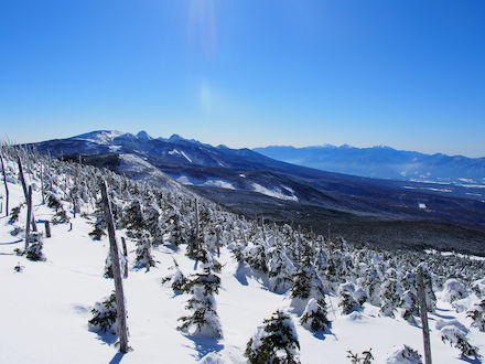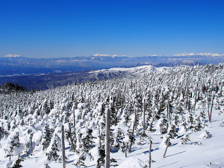 | これから歩く縞枯山 | 樹氷群を見ながら歩んでいく | ||