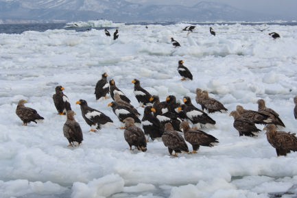 流氷の上には多くのオオワシ・オジロワシがとまっている。