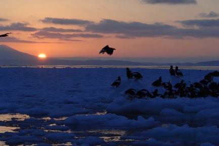 国後島羅臼山と流氷とオオワシ・オジロワシ