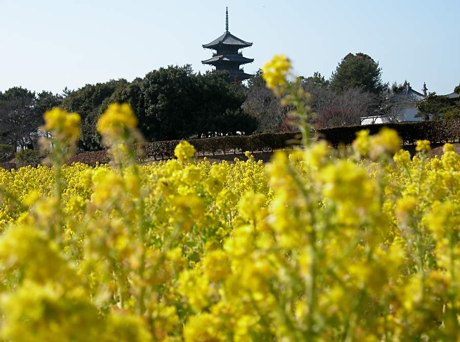 梅の香越しに五重塔を拝み、又、菜の花の香り越しに拝む五重塔も、何時しも変わらず。