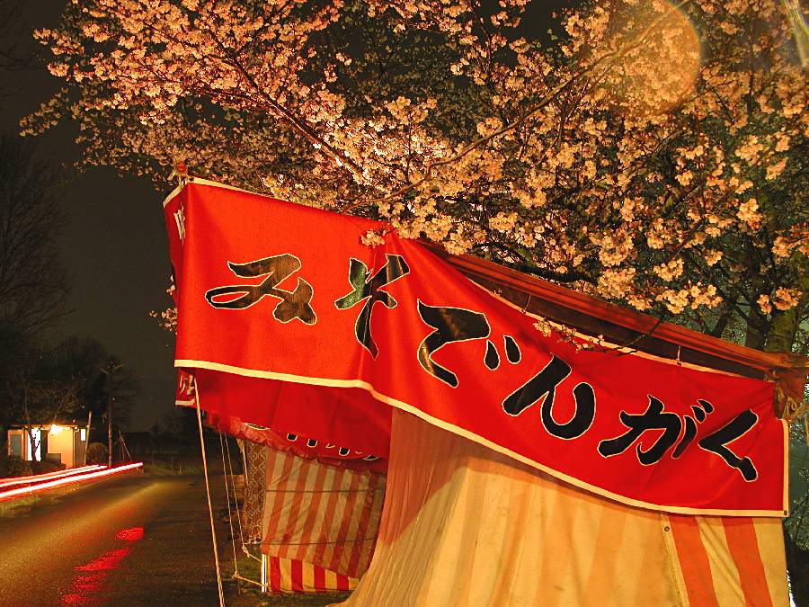 屋台も閉まり、夜桜を楽しんでいるのは地に降りた雨に反射する光だけ?