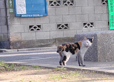 | 神社の境内近くで出会ったにゃんこ。 結構汚れてて、でもしゃきっとしてます。 すてててっと並足で歩いてました。 フーテンのにゃんこ。 丸顔の三毛。典型的な日本猫ですね。 |