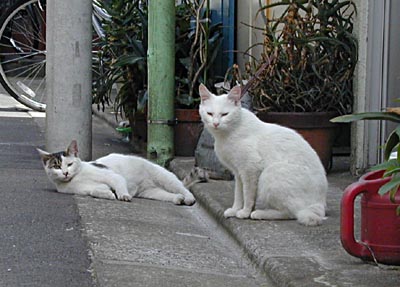 | 白ベースのニャンコペア発見w 一匹はホントの白猫、もう一匹はトラジマが 一部に入っるコ。 じーっとこちらを見ていましたね〜^^ |