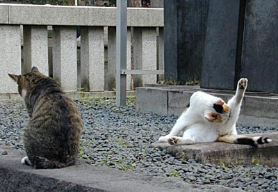 | 谷中墓地で見かけたにゃんこ。 三毛の方に注目! 足をピーンと張って毛繕い。 まるで体操のあん馬のようではないですかw 猫って体が柔らかいですよねー。 いぬ好きからすると、体がぐにゃぐにゃで 抱き上げるのが怖いそうですが・・・・(^.^;) そんなものなのかなー。 |