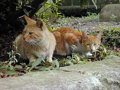 | 茶トラ白と、茶トラが仲良く。これも谷中墓地だったかな? 谷中墓地は樹木が多くてにゃんこ達にもすごしやすいようです。 けっこういっぱいニャンコがいますねー。 |