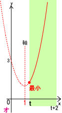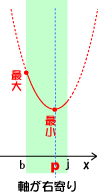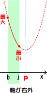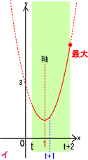 グラフが下に凸のとき、t≦x≦t+2のように定義域が変数であるとき、区間の幅は2である。この区間の中央位置と関数の軸の位置を比べて、軸が区間の中央の点と一致していない場合、軸の反対側にある定義域の最端が最大値。軸と同じ側の定義域の端が最小値である。
