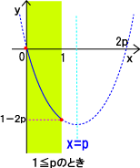 変域の右端(x=1)で最小となり、yの値が最小値。最小値1−2pをとる。
