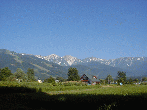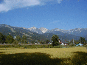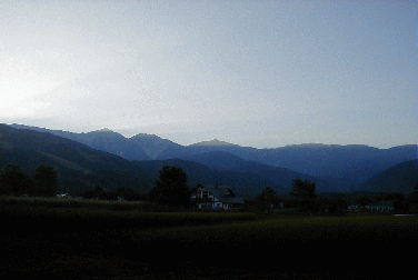 2005年6月、民宿「時計館」のある内山地区から見た夕暮れの白馬連峰です。