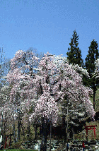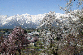 5月4日 新田の秋葉神社からの白馬連峰。右は、同じ場所にある徹然桜(しだれ桜)です。見事です。