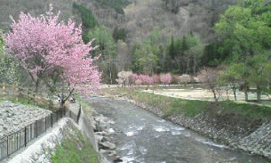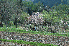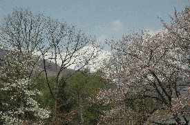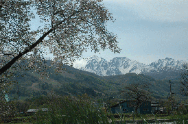 5月 5日 桜とコブシの競演! 真ん中の山は白馬槍ヶ岳です。