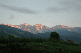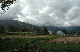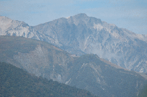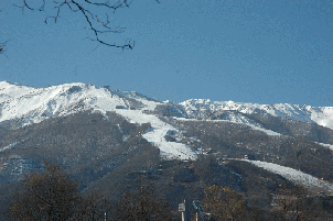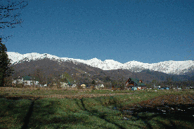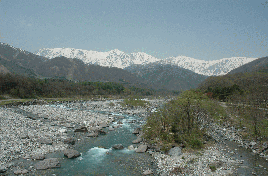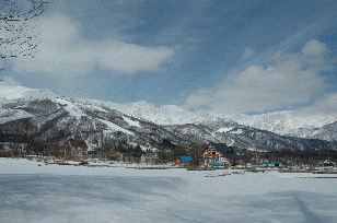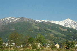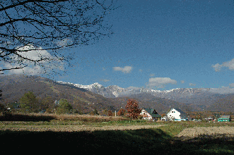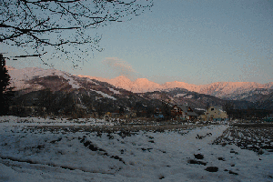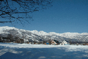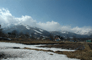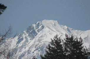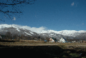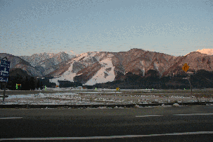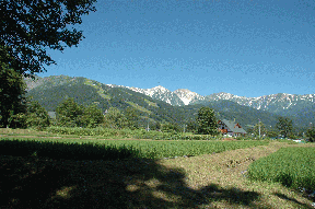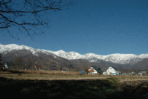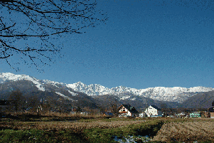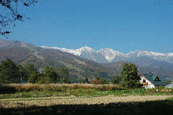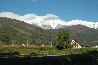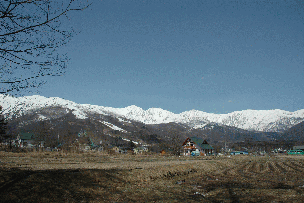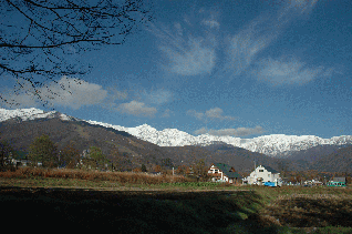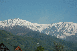 左は、406号白沢峠から見た北アルプス。(残念ながら杓子岳までで白馬岳は見えないんです。)