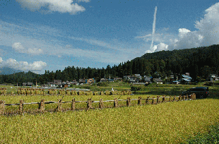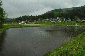 田んぼの向こうの集落は、民宿「時計館」のある内山です。