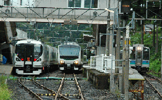 左から「あずさ」、「リゾートハイブリッド」、普通列車