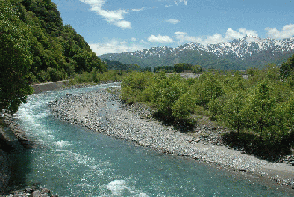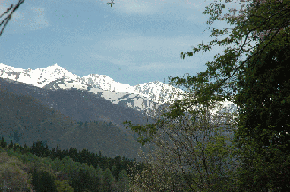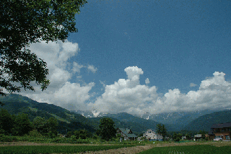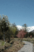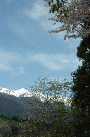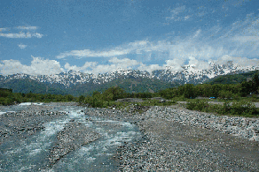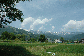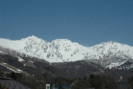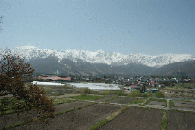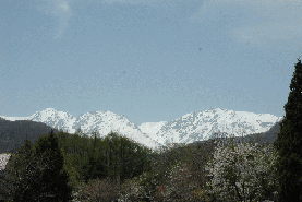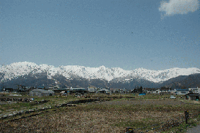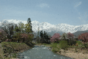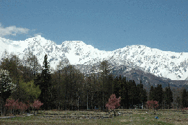 新緑とまだ咲き残っていた桜、そして白馬の山並み。