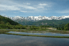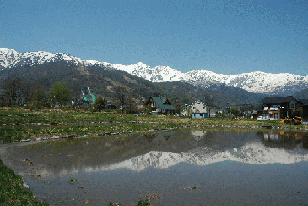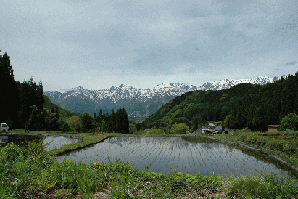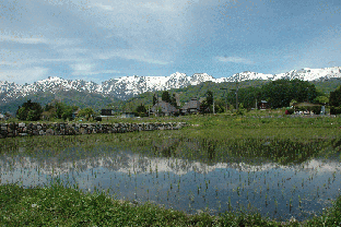 宿裏の田圃にも水が張られ、白馬の山並みを映しています。