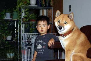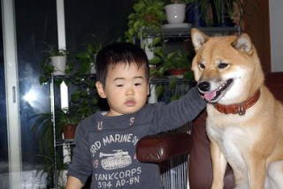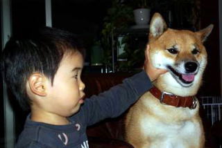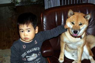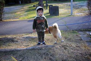 時にコロのリードを持つもまだ一人ではおぼつかない! | 時にコロの尻尾や耳を捕まえてはイタズラも! |