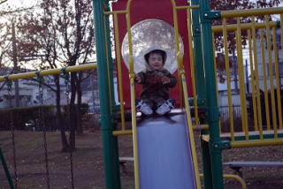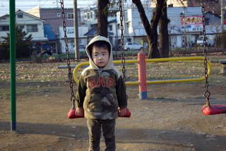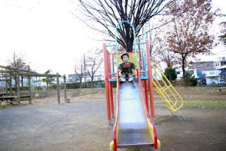 近くの公園の滑り台で! | 同じくブランコの前で! |