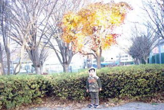 紅葉も終わり落葉し始めたモミジの木の前で! |