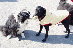 私がまだ、お友達と上手に遊べなかった時、 ロッチャンは、側に来て、かまってくれたの。 でも、すぐに知らん顔で、 大好きなボールにジャンピング! なんだか悔しくって、そのボールを 必死にとってやろうとしたわけ。 そんなことを繰り返しているうちに、 いつの間にか、お互いボールを咥えて じーとする遊び方が出来ちゃった(ハート。 ビキはね、この時とっても幸福な気分になるわ。 安心するっていうのかな? 最近は周りの人が面白がって見てるから、 俄然張り切って奪うようにしてるのよっ!!