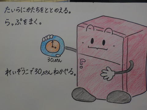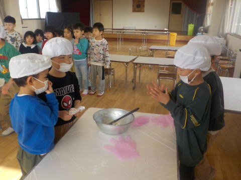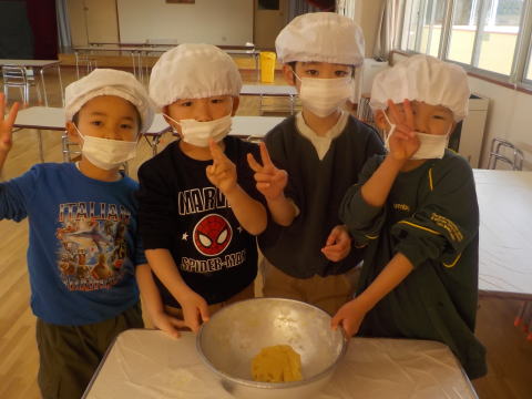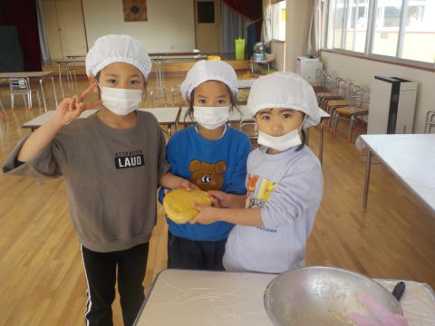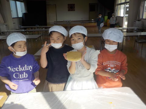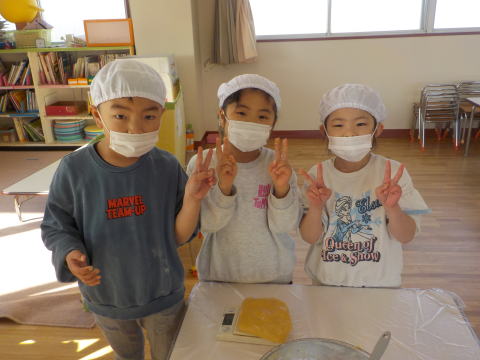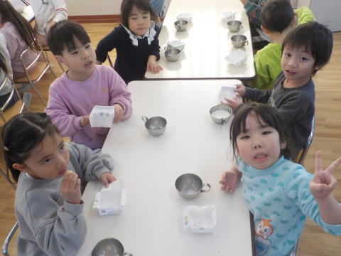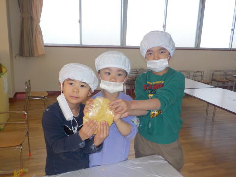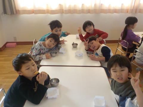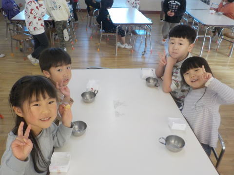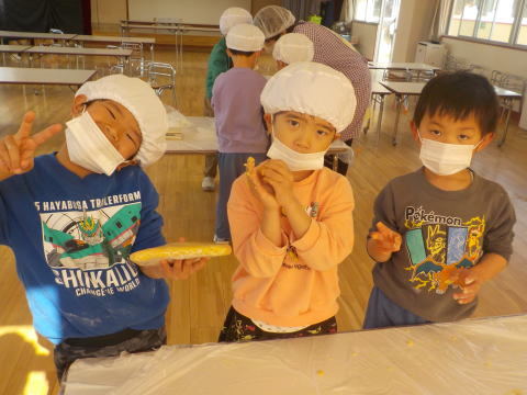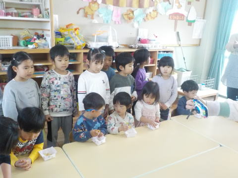 「こねこ組、りす組、ひよこ組にも 作ってプレゼントしたよ」 「おいしそーう。うれしい」 「ありがとう」 |