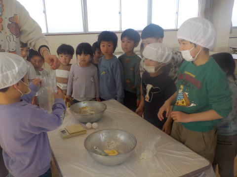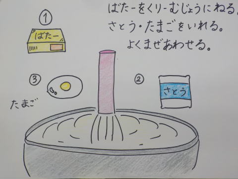 B「たまごはどーやっていれるの?」 「黄身だけ入れるんだよ」 「あっー たまごわれた。きみだけできた」 と大騒ぎでしたが生地が出来上がりました。 |