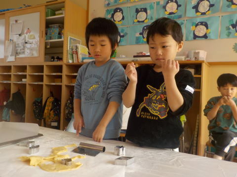 AM10:10 いよいよ型抜きをします。 生地をのばして 「ぼく、なにの形にしようかな?」 「ハートかな?」 |