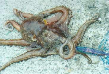 12時45分、餌木の着低を待って軽くリーリングしてラインスラッグを取るとグーッと重くなった。「ンン?、もしや!?」、ビュッとシャクルとズンとロッドが止まった。だが生物感が無い、根掛りである。ドラグを一杯に締め付けラインとロッドを一直線にして引っ張る。するとズズズッと言う感じで動きだした。何かとんでもない物でも引っ掛けちまったのかなと更に引っ張ると前にも増して動いて来た。そうして次第にリーリング出来るような重さになり、遂に海面にそれは浮かんで来た。正体はタコであった。最初のリーリングで異変に気付いたタコはガッシリと海底に踏ん張って居たのだろう。