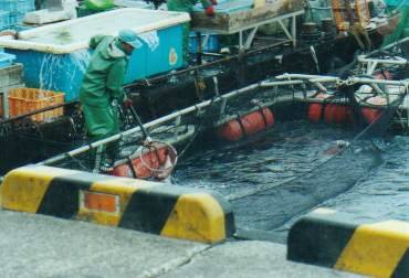 先端で投げ釣りをして居たお兄さんが帰ったので釣四郎はそちらに移動。暫くして、すぐ横の生簀で出荷の作業が始まった。生簀の鯛やらイナダを網ですくい出して、その場で絞めて出荷している。箱には某大手メーカーの名前が。きっとスーパーやデパートの食品売り場に並ぶのだろうな。社会勉強をしちゃいました。
