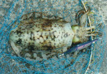 エギングはキャストして着低までの間暇である。そんな訳で釣四郎はこの人のシャクリ方を見ていたのだけれども、大きくシャクッたロッドがリールのドラグの悲鳴と共に頭上で一瞬止まった。その瞬間釣り人はロッドを見上げて直ぐにリーリングを開始。グングンとロッドはその先に生物の存在を示している。直ぐに茶色の物体が水面に揚がって来た。タモに収まった獲物を覗きに行くと、家紋のような丸い模様のあるカミナリイカ(モンゴイカ)であった。