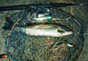 さあ釣り再開。先程の場所からチョイト下がってラパラをほおり投げる。コンコン!。おっ、ビシッとアワセるけれども乗らない。もう一度トライ。クン!。よっしゃあ!。ビシッ!、くっそー乗らない。さらにもう一回。しかしながら、それからアタリが無くなった。
