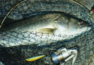 よっしゃああ!。ビシッと合わせるとばっちりフッキングに成功。一気に水面に出て来たシーバスは半分顔出しの横へスライドして行くような中途半端なエラ洗い。少しだけドラグを鳴らしたけれども温かい季節の時のような漲るパワーは噴出しない。あっさりとタモに収まった。