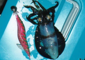 水面に上がって来たのは紛れも無くアオリイカだった。すかさずルアーマンがタモで掬ってくれる。ちょっと小振りだけれどもキープサイズのアオリイカ。うれしーっ!。陸に上げられても尚、このイカは餌木をしっかり抱いていた。この貪欲さがコイツの命取りとなったのだろう。